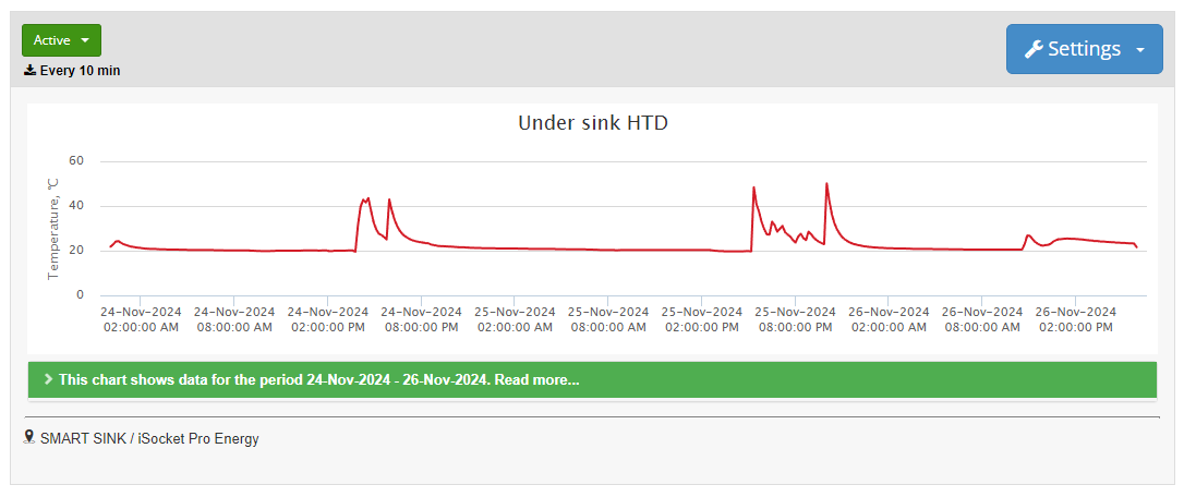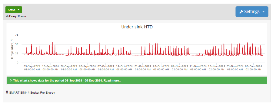 Keep in mind that with a 10-minute temperature collection interval, some water usage events might be missed. For example, if the temperature is recorded just before someone turns on the faucet, and then the new 10-minute interval starts, the temperature spike from the hot water flow may be missed if the pipe cools down quickly after the faucet is turned off.