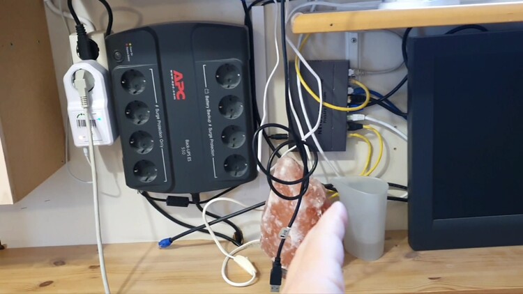 So I just press this switch and you hear a beep from the UPS or the backup power, which indicates that the power has been interrupted. I don't want to test on real routers or modems to reset them, so I'll just show you on the power backup. Then I put it back, I think you heard a click.